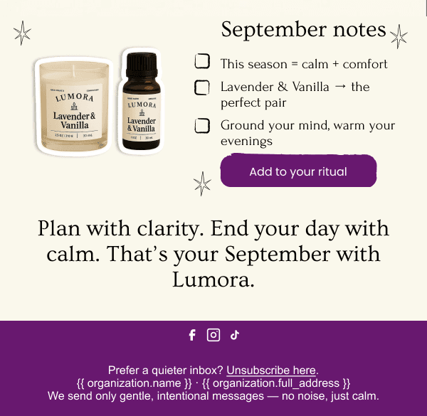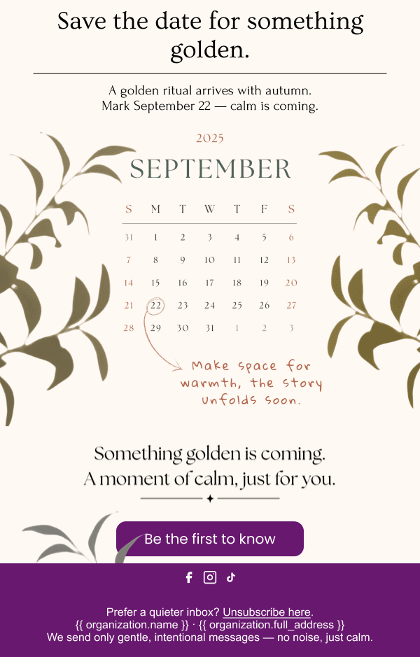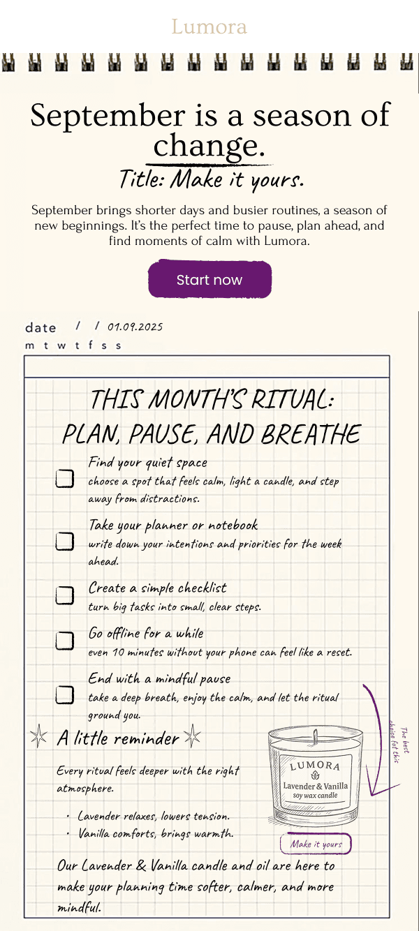 Ta wiadomość otwiera wrzesień jako nowy etap i nadaje rytm całej kampanii. Mail wykorzystuje kontekst zmiany sezonu, aby zaprosić odbiorcę do zwolnienia tempa, zaplanowania codzienności i znalezienia własnych momentów spokoju. Zamiast komunikatu sprzedażowego pojawia się prosty, praktyczny rytuał, który odbiorca może realnie wdrożyć w swoim dniu.
