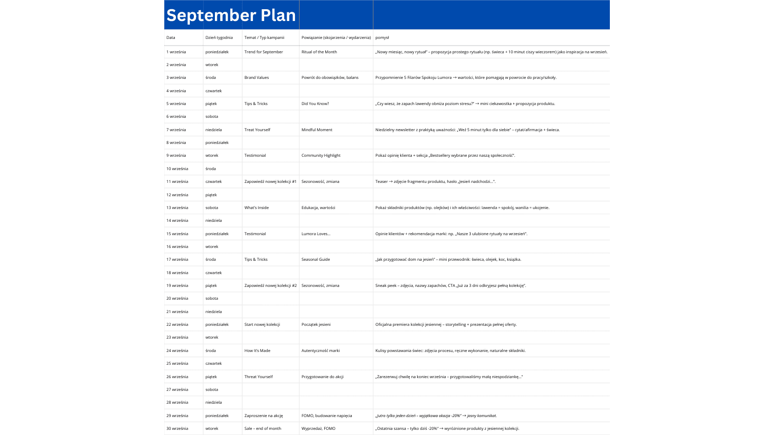 Na potrzeby kampanii „Rytuały Spokoju” zaprojektowany został miesięczny kalendarz komunikacji, oparty na sezonowości, rytmie marki i zachowaniach odbiorców. Kampania obejmowała regularne wysyłki (3–4 wiadomości tygodniowo), z jasno określonymi tematami, tonem komunikacji i rolą każdego maila w procesie sprzedaży.