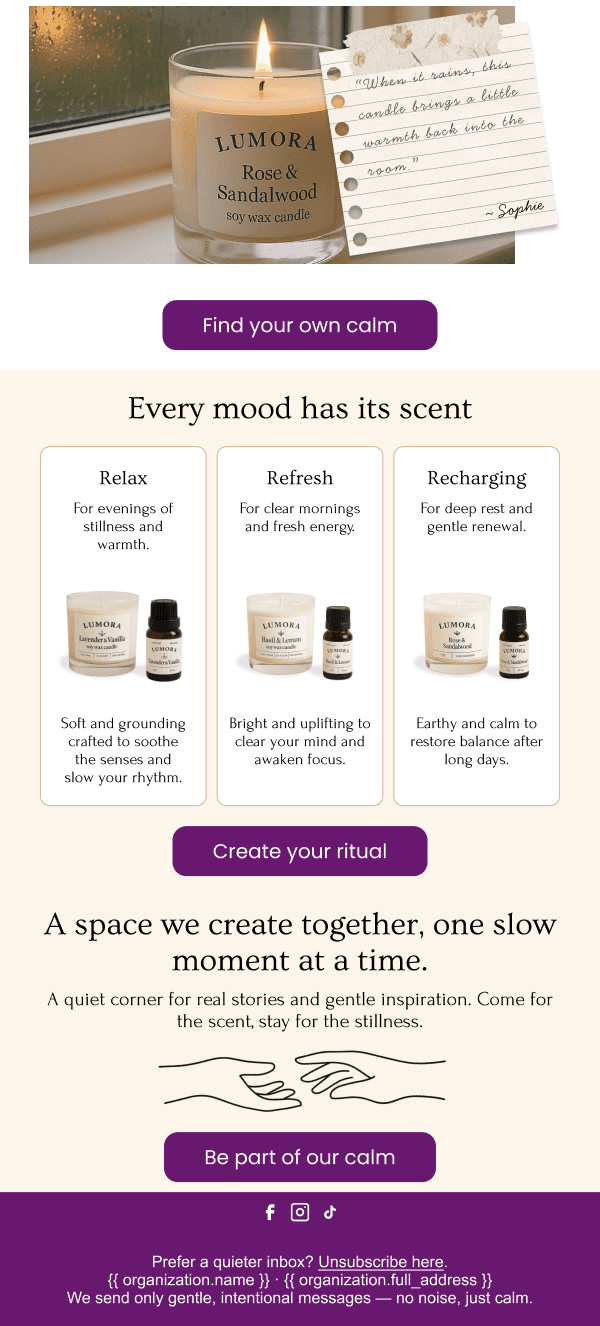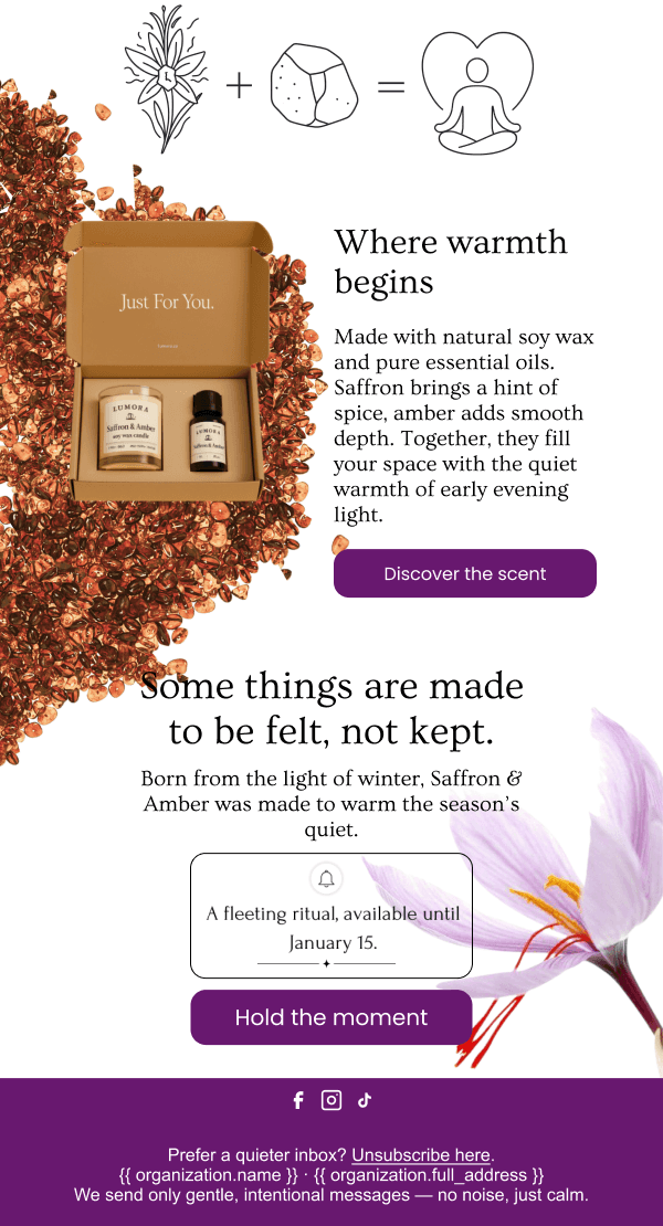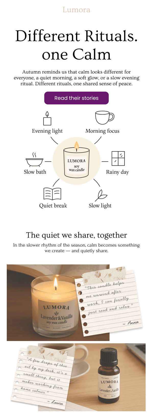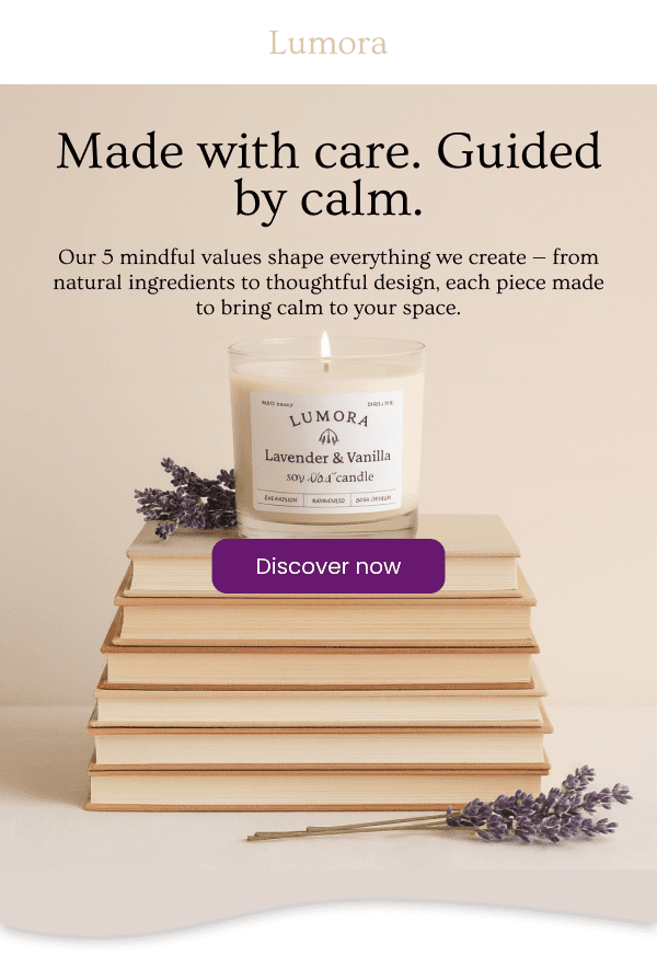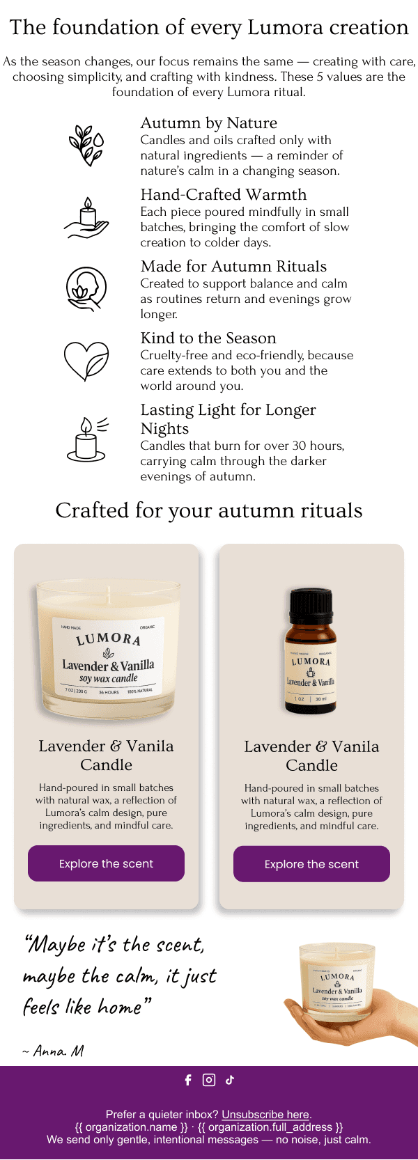 Ta wiadomość koncentruje się na pokazaniu fundamentów marki Lumora i zasad, które stoją za każdym produktem. Mail tłumaczy, w jaki sposób naturalne składniki, ręczne wykonanie i uważny proces tworzenia przekładają się na realne doświadczenie spokoju w codziennych rytuałach.