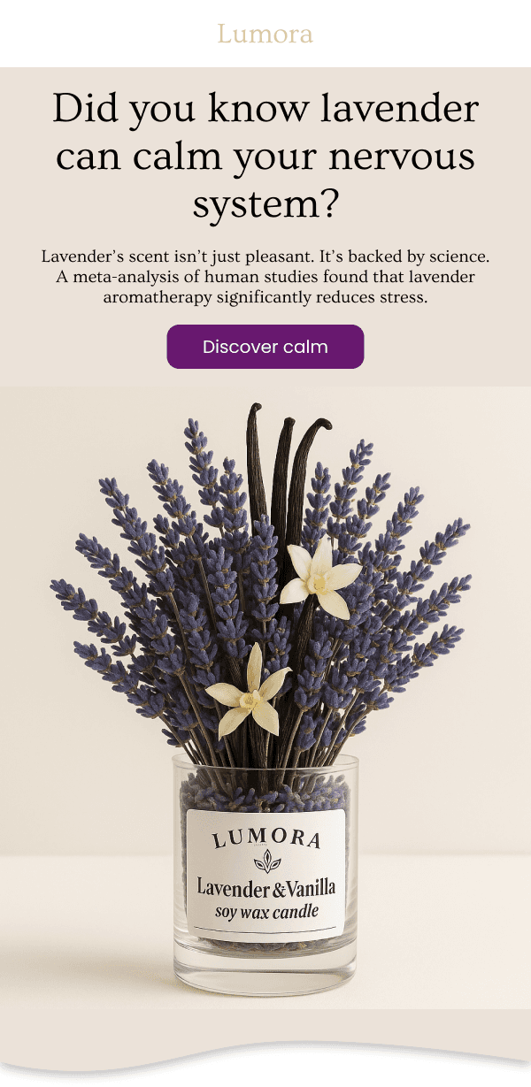 Ta wiadomość koncentruje się na edukacji i wyjaśnieniu, dlaczego produkty Lumory realnie wspierają codzienny spokój. Mail wykorzystuje prosty fakt naukowy dotyczący działania lawendy, aby zbudować zaufanie i wiarygodność bez nachalnej sprzedaży.