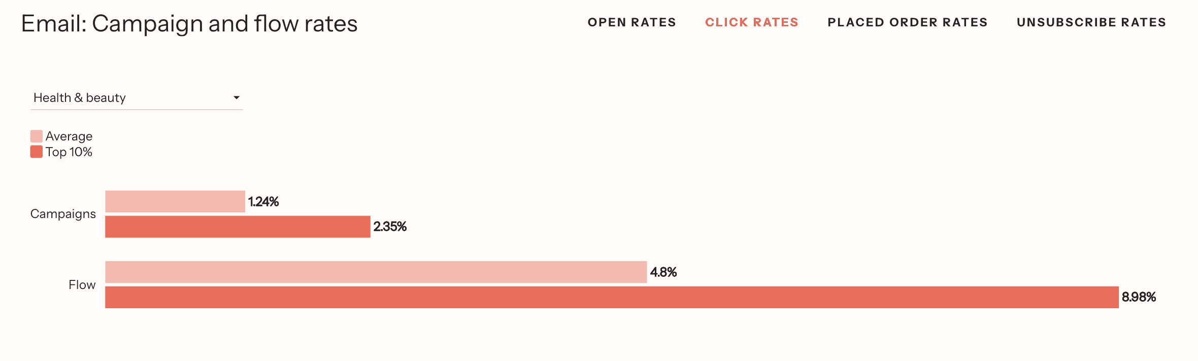 Powyższy wykres przedstawia benchmarki Klaviyo dla współczynnika kliknięć (CTR) w kampaniach e-mailowych oraz automatycznych flow w branży Health & Beauty. Dane pokazują wyraźną różnicę w skuteczności obu typów komunikacji. Średni CTR dla kampanii wynosi około 1,24%, natomiast automatyczne flow osiągają średnio 4,8%, a najlepiej działające marki nawet do 8,98%.